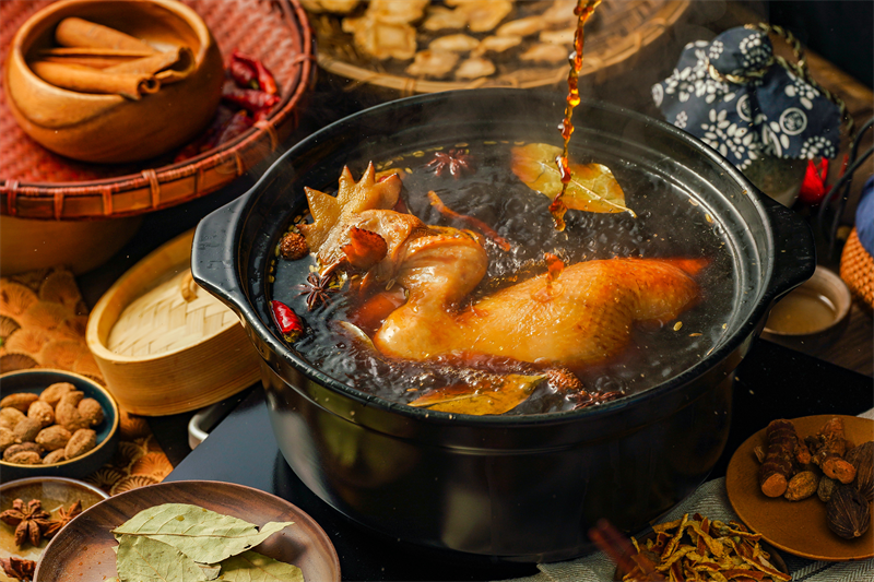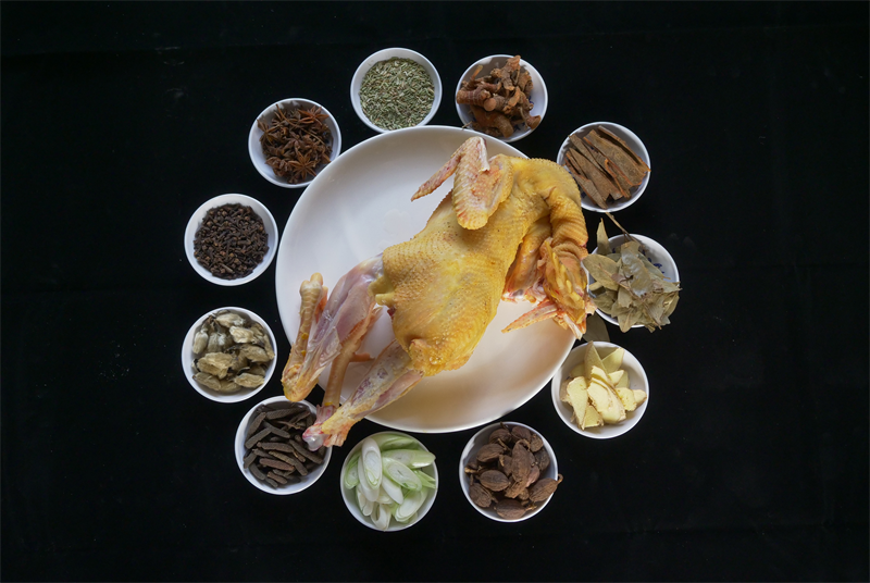 金凤扒鸡采用独特的制作流程与工艺,经十二道工序精制而成,所用原料均为生长期450天以上的健康蛋鸡,制成“恭卧状”造型(双翅衔于口中,双腿卧入腹腔),周身涂抹蜂蜜后入油锅炸至金黄色,再用老汤佐以十八味辅料焖煮十四个小时之后(其中不添加任何防腐剂),具有炸得匀、煮得久、焖得烂、易脱骨、色形美、香味厚的特点。