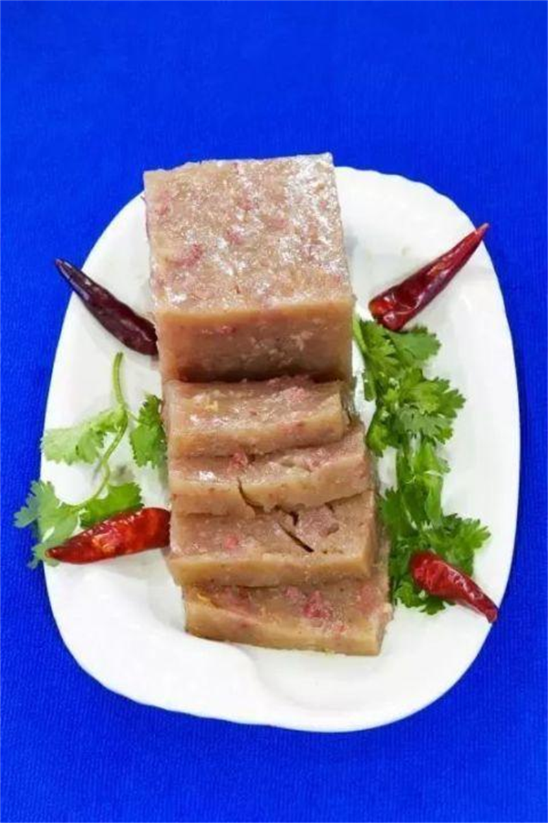 西河肉糕起源于深泽县西河村,是深泽县最为著名的小吃烧饼裹肉的主要的组成原材料。西河肉糕以红薯淀粉、驴肉为主料,驴油、香油为辅料,以多种调味品为佐料。将驴肉剁成肉馅,用煮肉的老汤将淀粉、肉末、油一并调好,加入调料,上锅蒸制而成。具有柔软而有弹性、滑嫩鲜香而不腻、老少皆宜的特点,是宴请宾客必不可少的名吃。