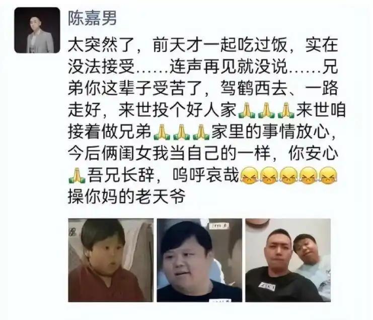 2023年2月20日,演员陈嘉男在社交账号上,发布了好友陈晨突然去世的消息,令人唏嘘。